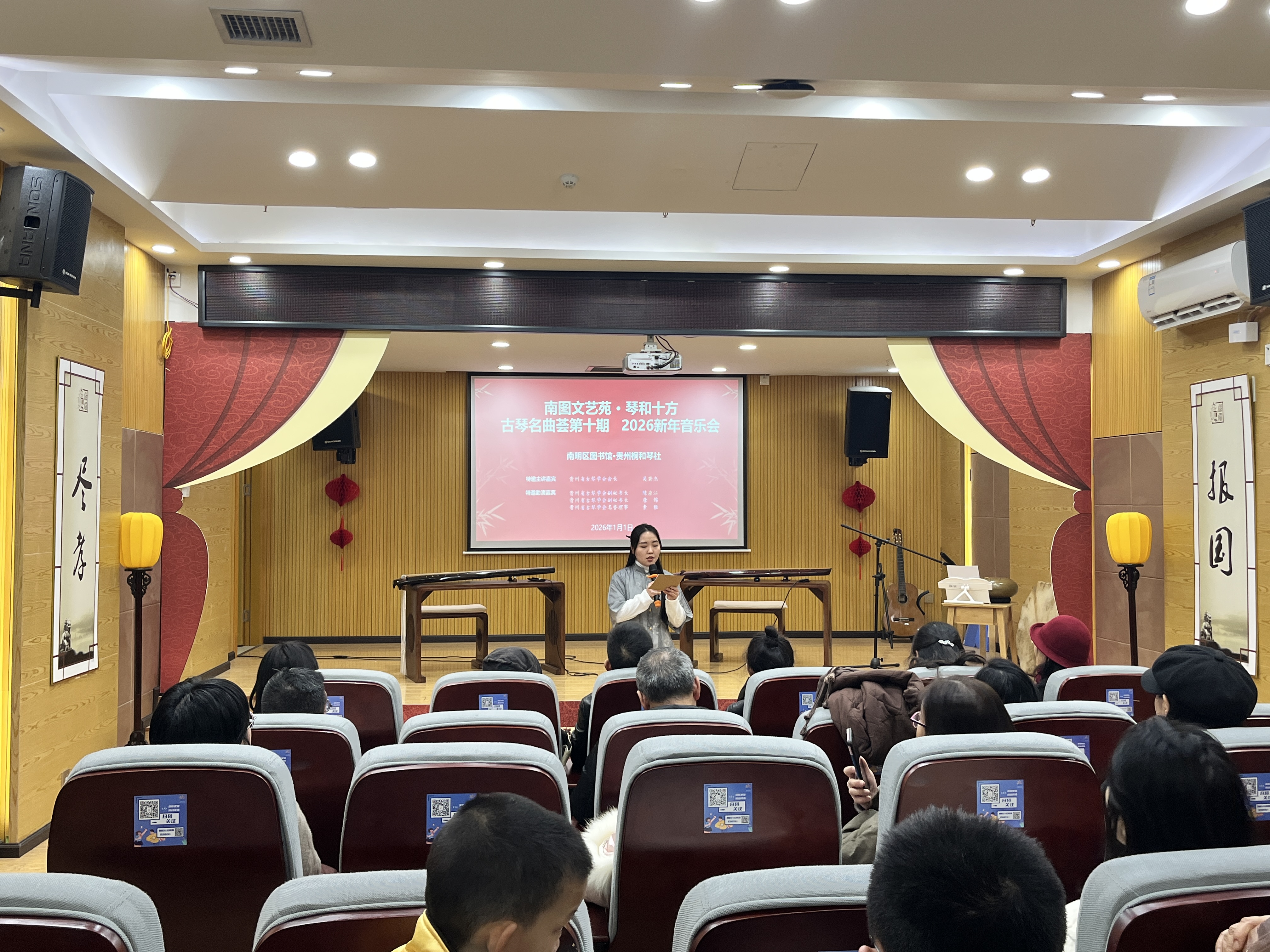 贵阳网·贵阳新闻讯 1月1日,元旦佳节之际,南明区图书馆举行2026新年古琴音乐会,为持续近一年的古琴文化之旅画上圆满句号。60位市民齐聚图书馆,在空灵雅致的琴音中辞旧迎新,感受传统与创新交融的文化魅力。