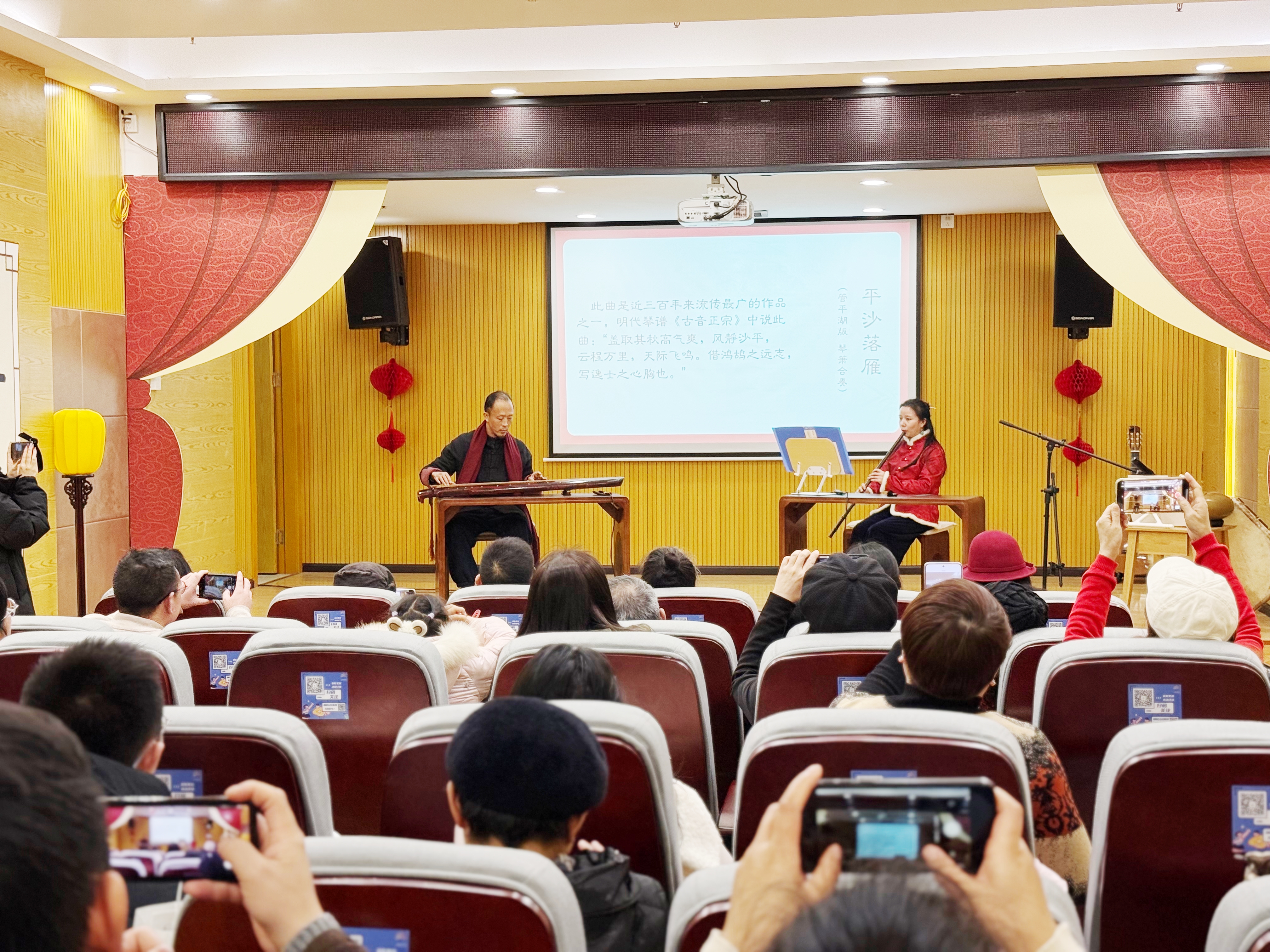 此次新年古琴音乐会以“传统与创新”为核心主题,内容兼具专业性与互动性。古琴文化分享中,贵州省古琴学会会长深入浅出地解读了古琴文化传承脉络与当代发展方向,让观众深刻理解千年琴艺的时代生命力。演奏环节中,《尧畅》《天保》等8首风格各异的曲目轮番上演,既有传统古琴名曲的古朴悠远,亦有经古琴改编的电视剧主题曲《不染》等创新作品,传统琴韵与现代审美碰撞出独特火花。为增强市民读者参与感,在《不染》《四月八》等曲目演奏后,主持人抛出听曲问题,现场读者气氛踊跃,欢声笑语中让古琴文化更显亲切。